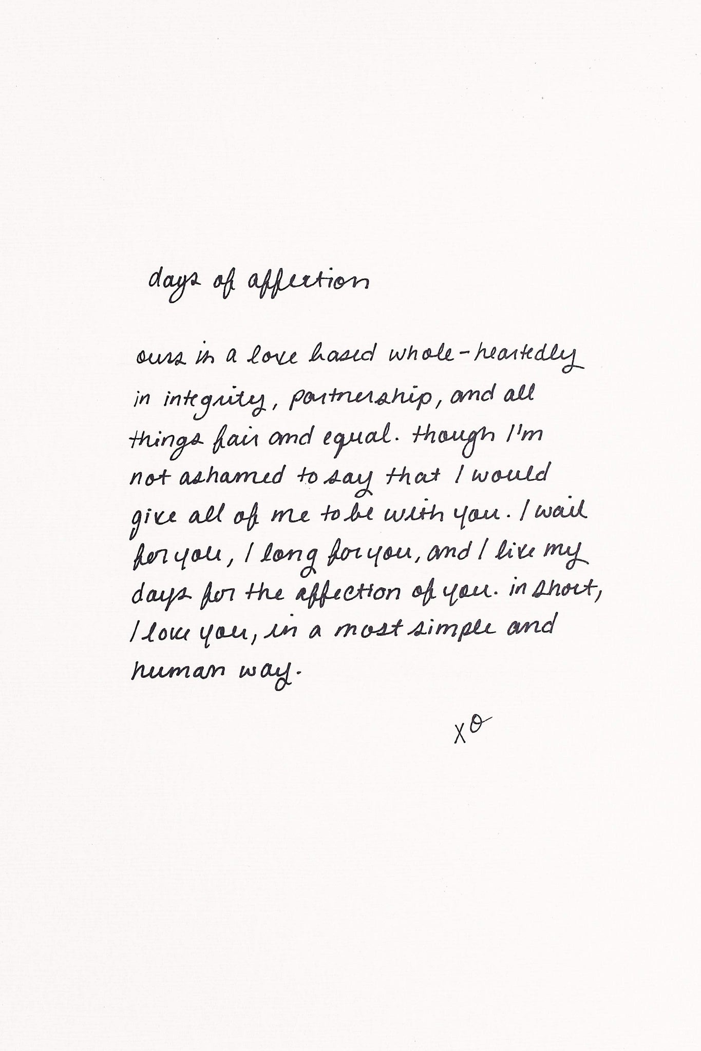 Ours is a love based whole-heartedly in integrity, partnership, and all things fair and equal. Though I’m not ashamed to say that I would give all of me to be with you. I wait for you, I long for you, and I live my days for the affection of you. In short, I love you, in a most simple and human way.