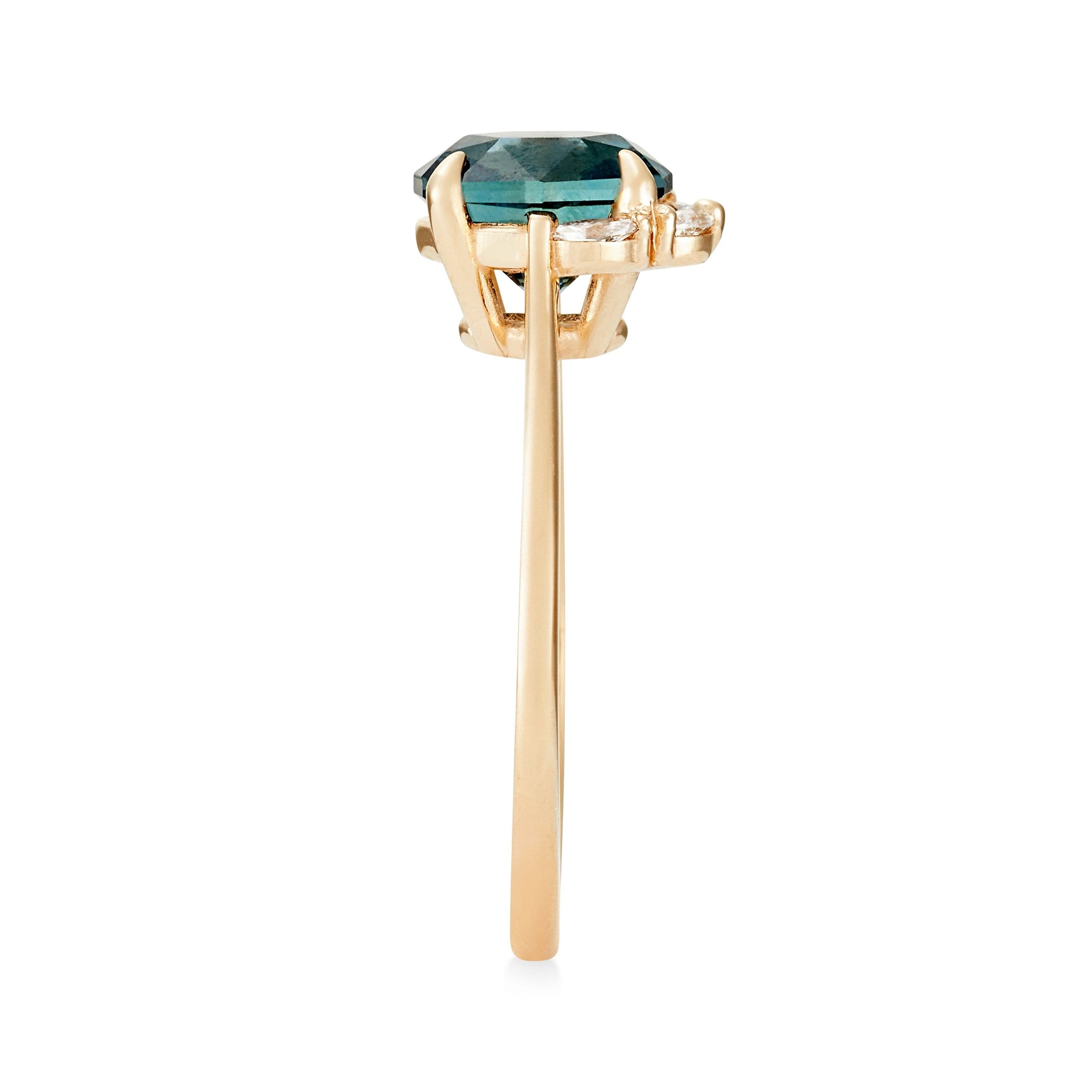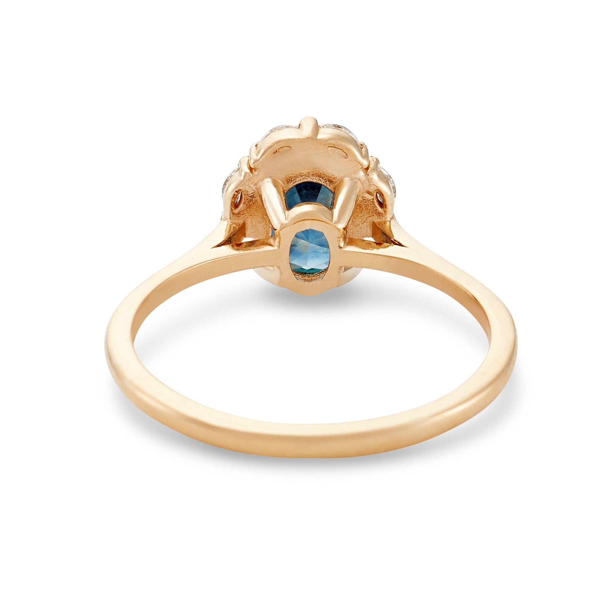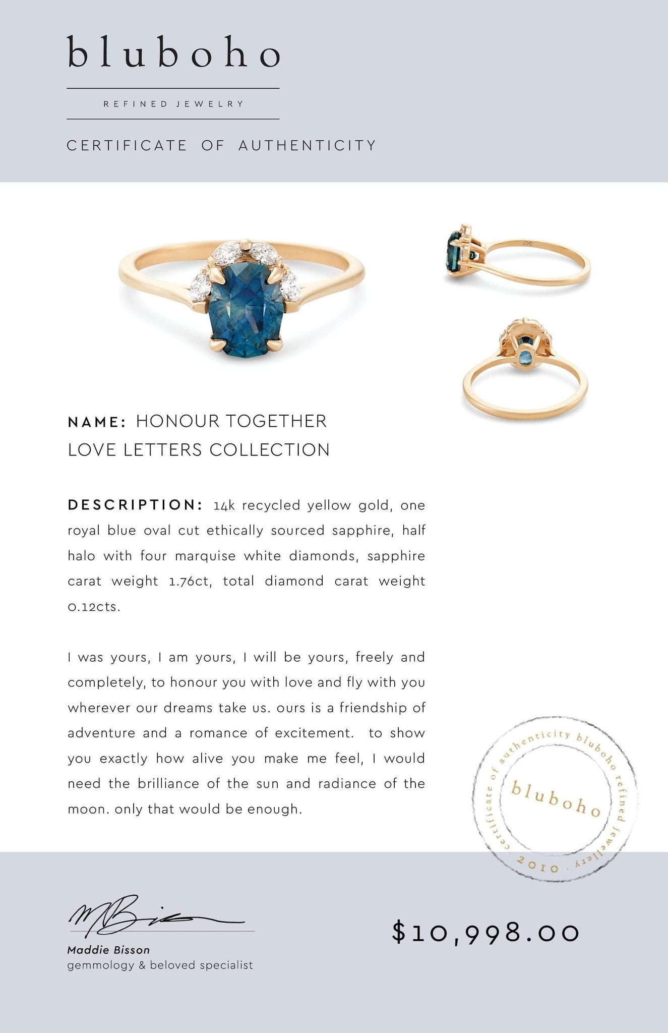 The honour together ring features a highly saturated royal blue oval cut sapphire that has been ethically sourced from the wild plains of Montana. This design is brought to life by a unique half halo that rests atop the centre stone, composed of four marquise white diamonds.