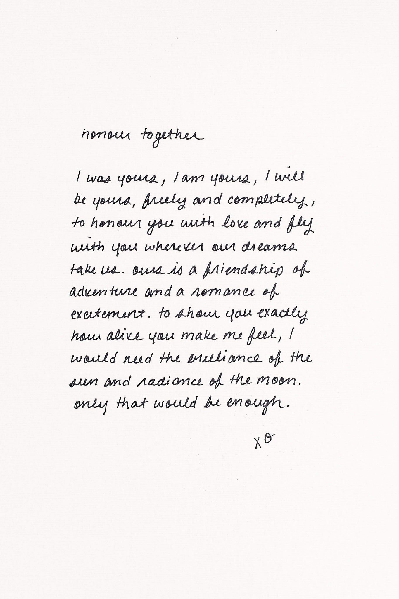 I was yours, I am yours, I will be yours, freely and completely, to honour you with love and fly with you wherever our dreams take us. Ours is a friendship of adventure and a romance of excitement. To show you exactly how alive you make me feel, I would need the brilliance of the sun and radiance of the moon. Only that would be enough.