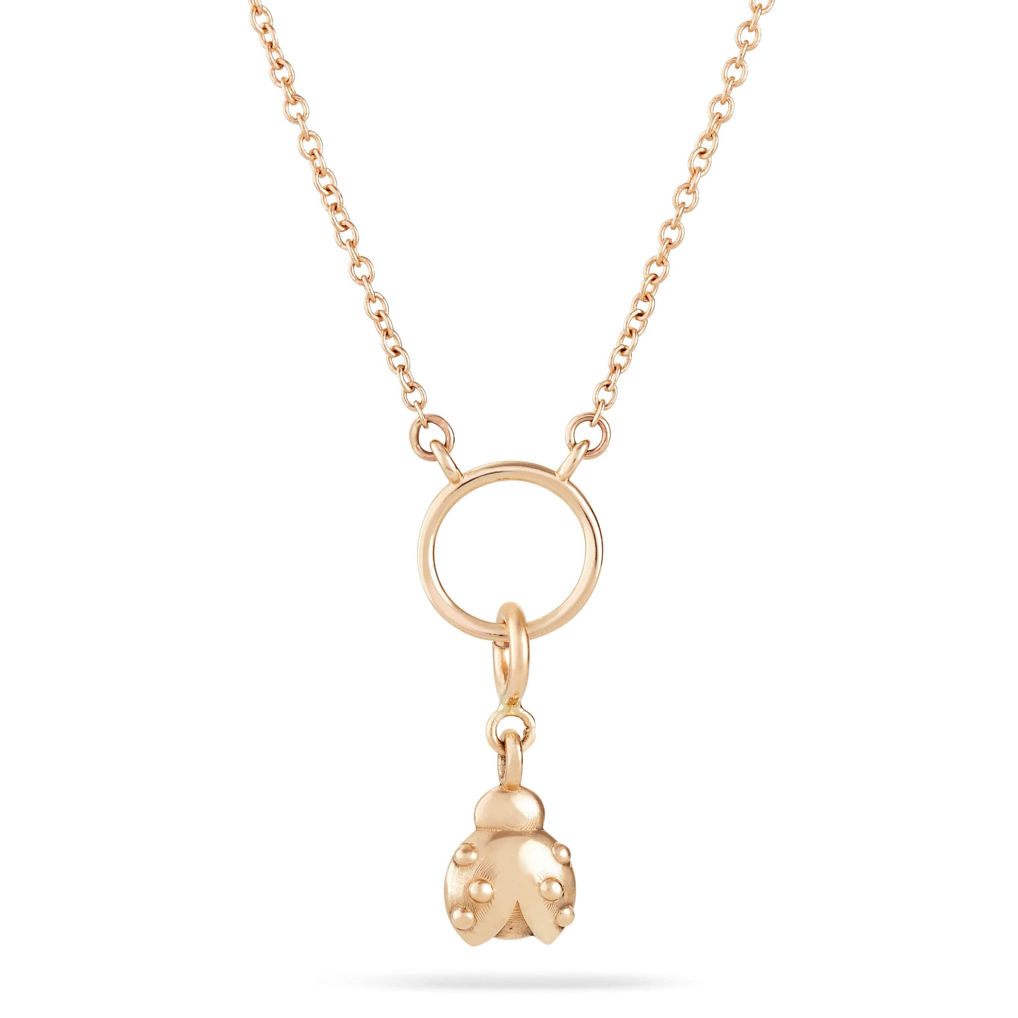 Love bug Charm is an exquisite emblem made of solid polished gold. Essential necklace a simple all curb chain of 14k solid gold with a smaller circle. Perfect on its own or adorned with your magical collection of Wanderess charms.