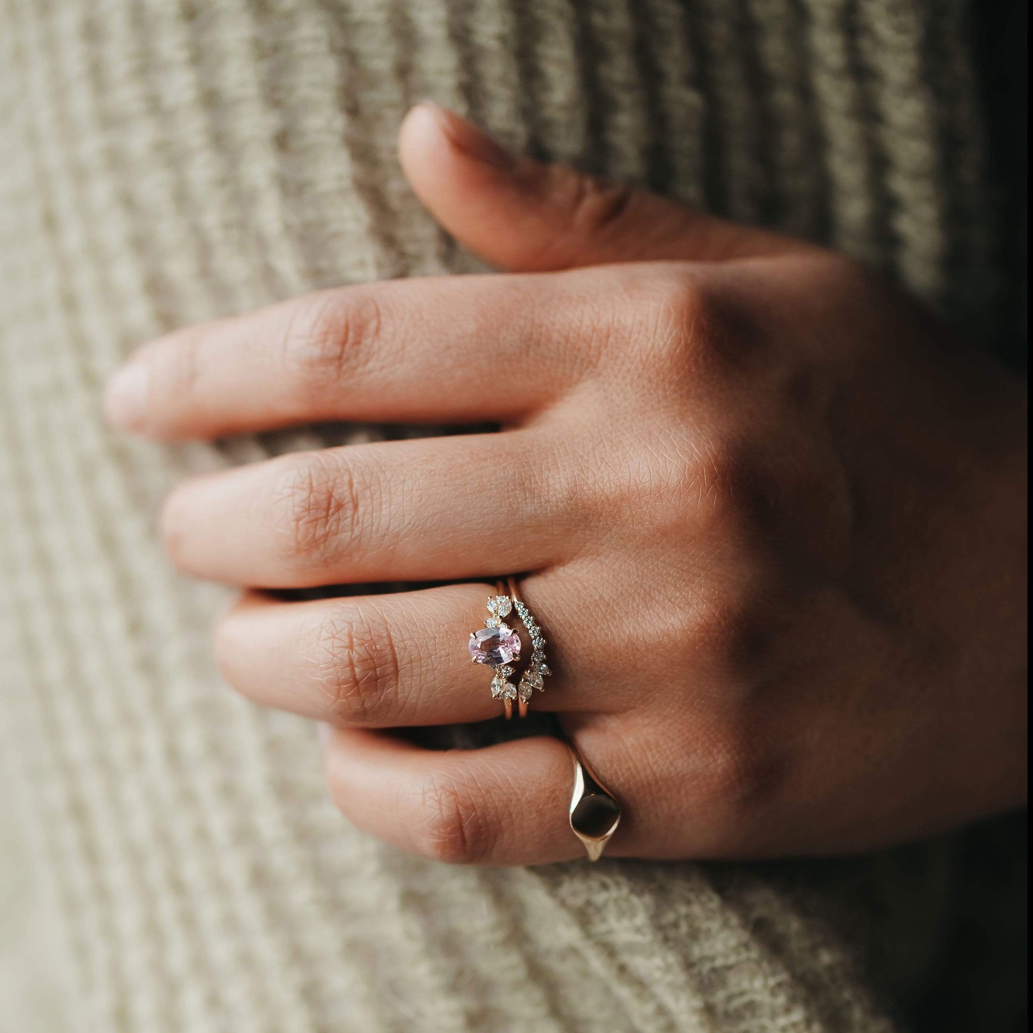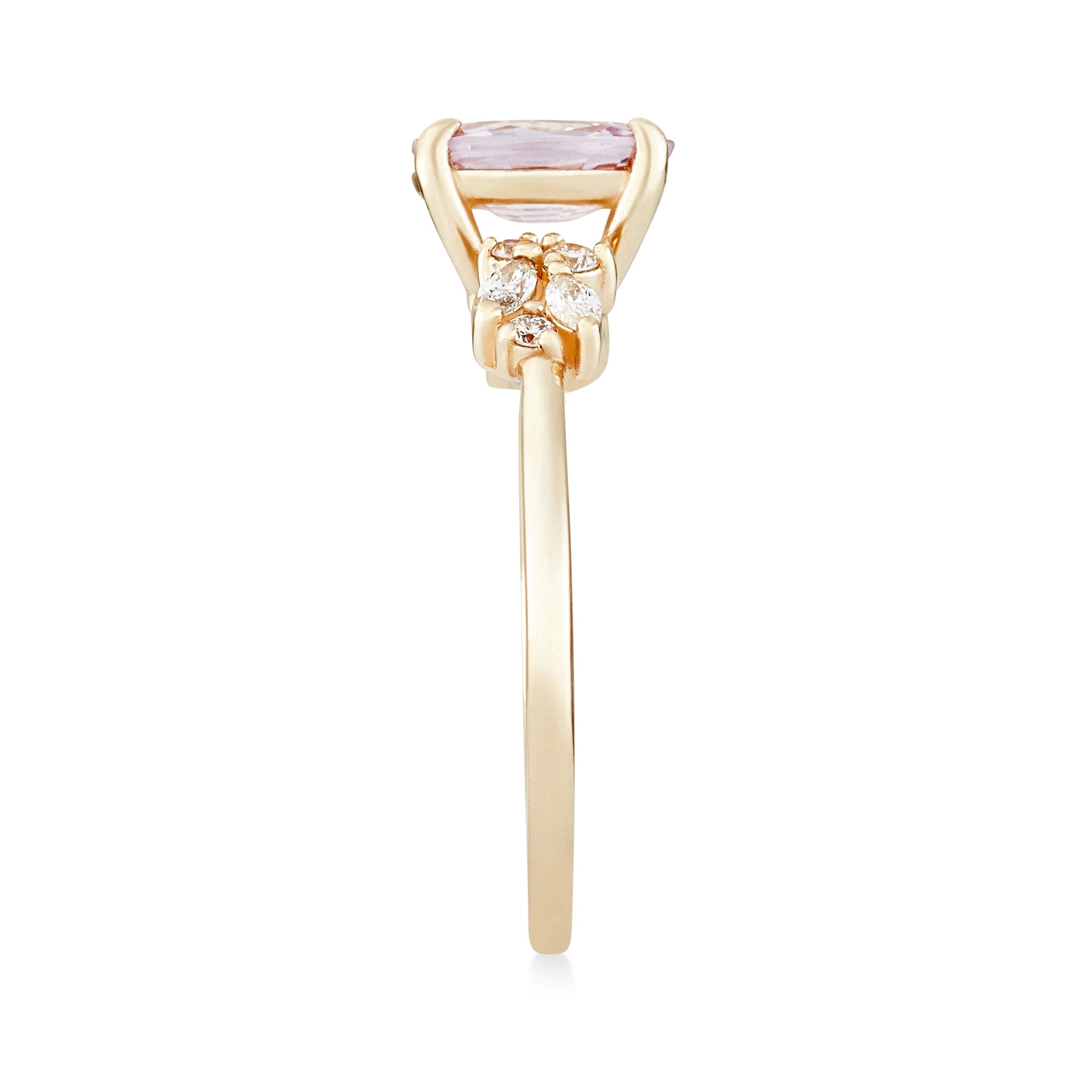 Hold your love close to your heart each day with the radiate ring’s warming tones of rosé and coral. This blush pink oval cut sapphire is set on an ultra slim band made of recycled 14k yellow gold, and framed by petals of marquise and round white diamonds.
