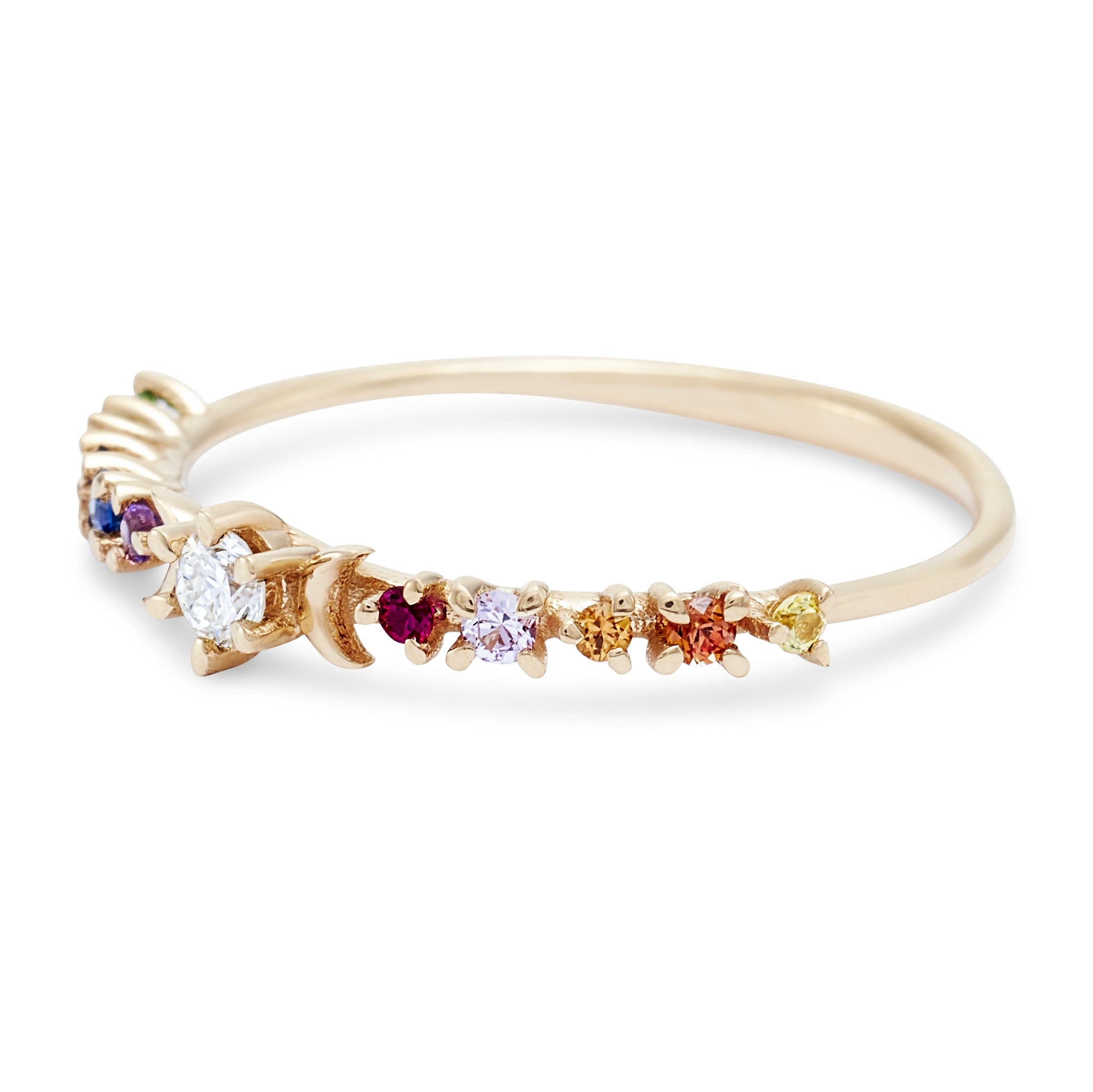 It contains a diamond center stone with rainbow gradient side stones: emerald, light blue sapphire, blue sapphire, orange sapphire, tsavorite, amethyst, dark orange sapphire, yellow sapphire, ruby. Perfect for a wedding band or ceremonial piece and wonderful at stacking together with a multitude of other rings for a meaningful personalized stack all your own!