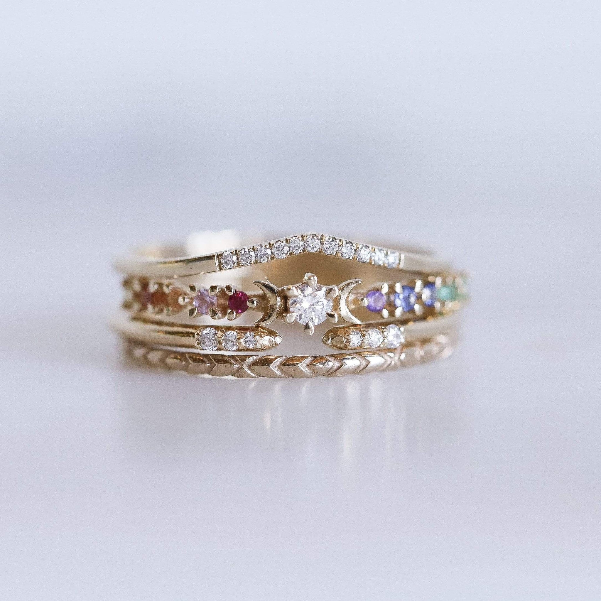 This beauty was inspired by the enchanting E. E. Cummings quote “you are my sun, my moon, and all my stars...”. A wearable piece of poetry that will whisk you away every time you glance down at it. This is the band version of the Wandering Starring.