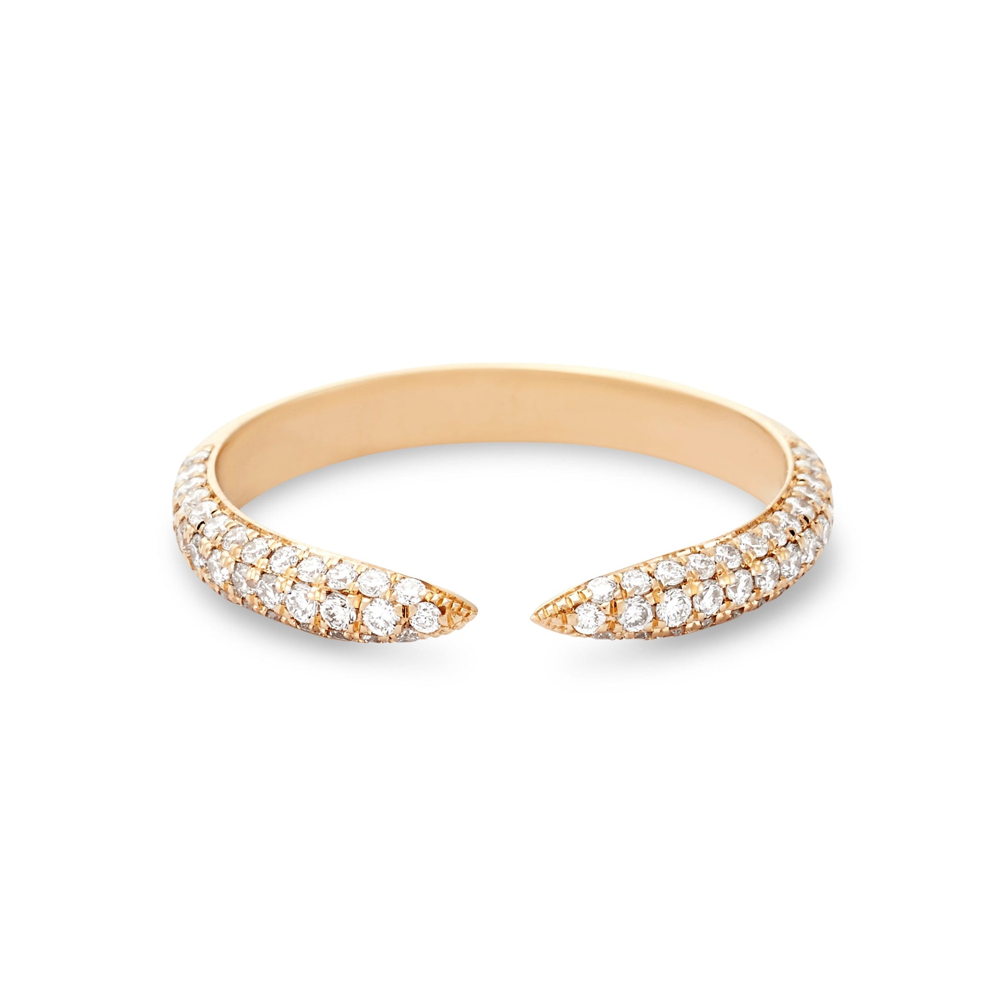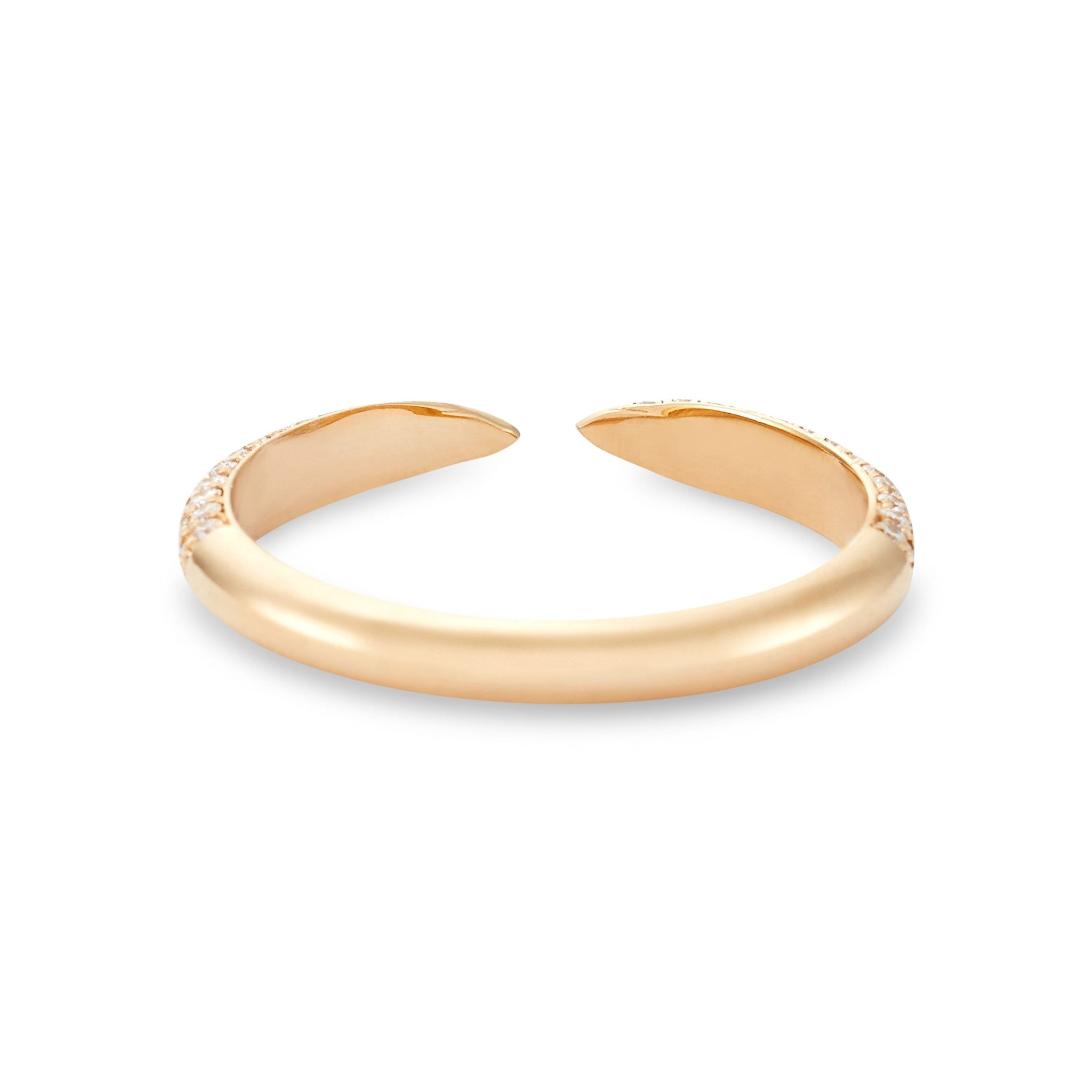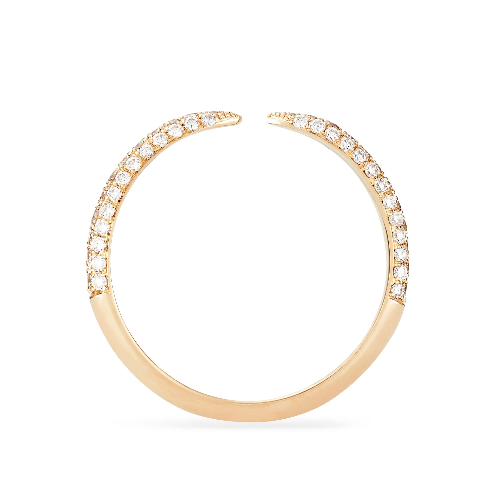 Our twin flame ring tells the story of two hearts meeting through its cuff-shaped design and dazzling rounded half eternity band. Three rows of micro-pavé white diamonds crawl up either side of the 14k gold band. This is finished with two tapered band edges, making this cuff ring as remarkable as it is comfortable.